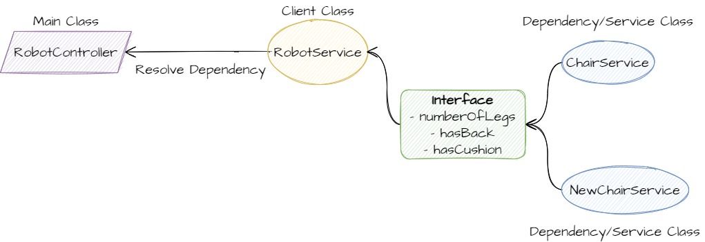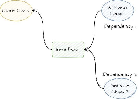 As evident from the above diagram, now our main client class need only the interface and we can use whatever service class as we want.